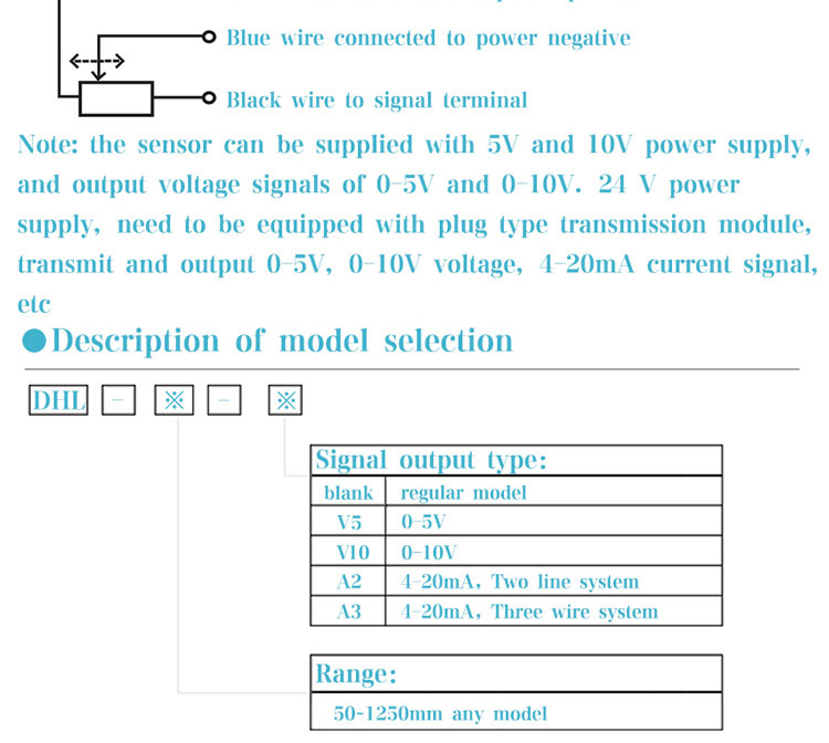 Brief introduction:The linear displacement sensor based on potentiometer principle is a linear displacement sensor with sliding rheostat structure. The sensor can supply 5V or 10V power, output 0-5V, 0-10V voltage signal, or 12-24V power supply. It is equipped with transmission module to output 0-5V, 0-10V, 4-20mA analog signal, which is convenient to connect with PLC control system for processing and calculation. The common wiring methods of displacement sensor are: two wire system, three wire system and four wire system. The displacement sensor with 4-20mA current signal can adopt two-wire wiring method. The power supply, senso...... [MORE]
